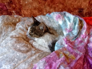 A cat, napping on a sofa in a pink- white blanket- close-up, watercolor painting imitation filter applied, studio shot, close up